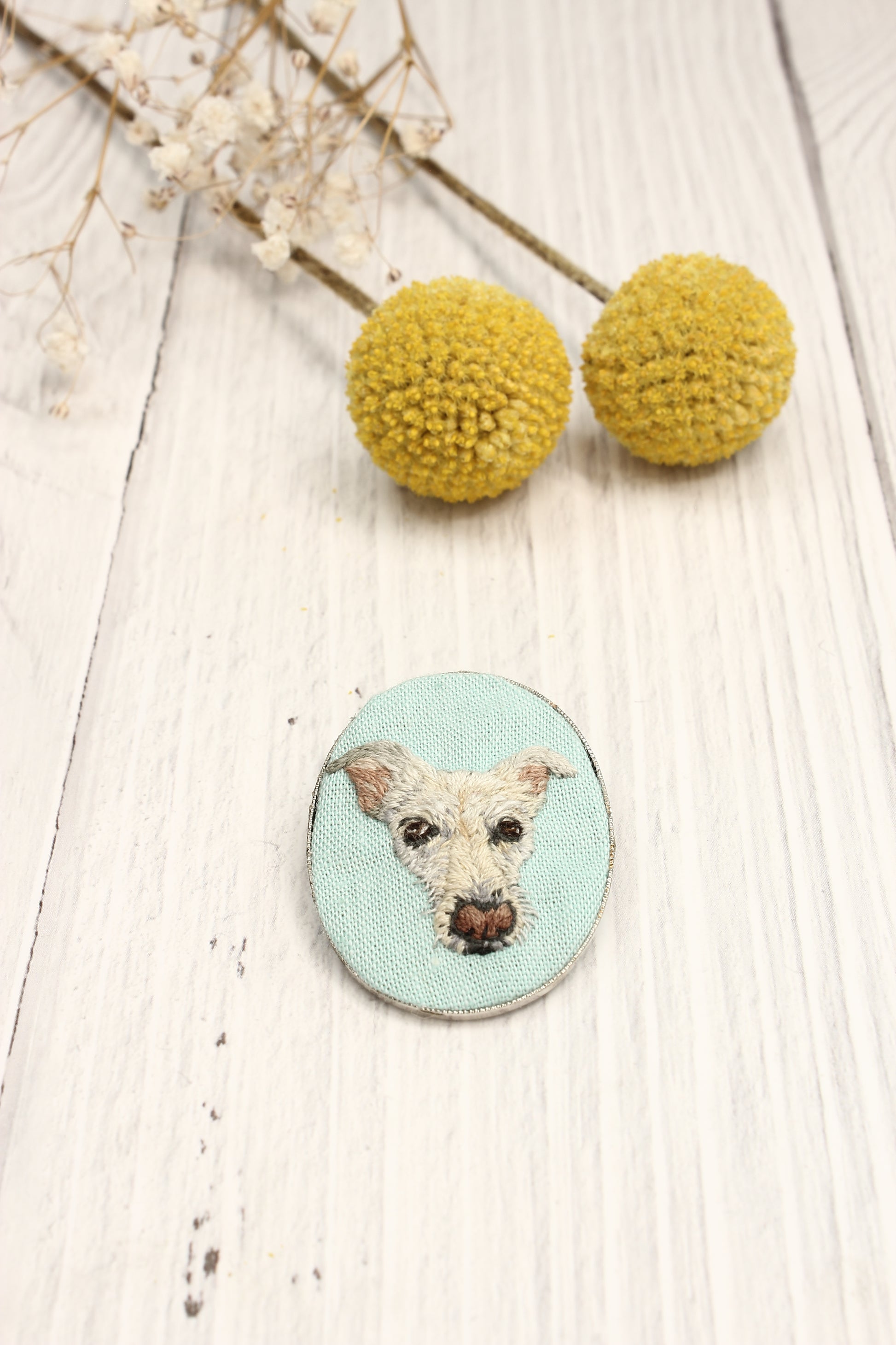 Handmade Dog Brooch embroidered on an Aqua cotton fabric.