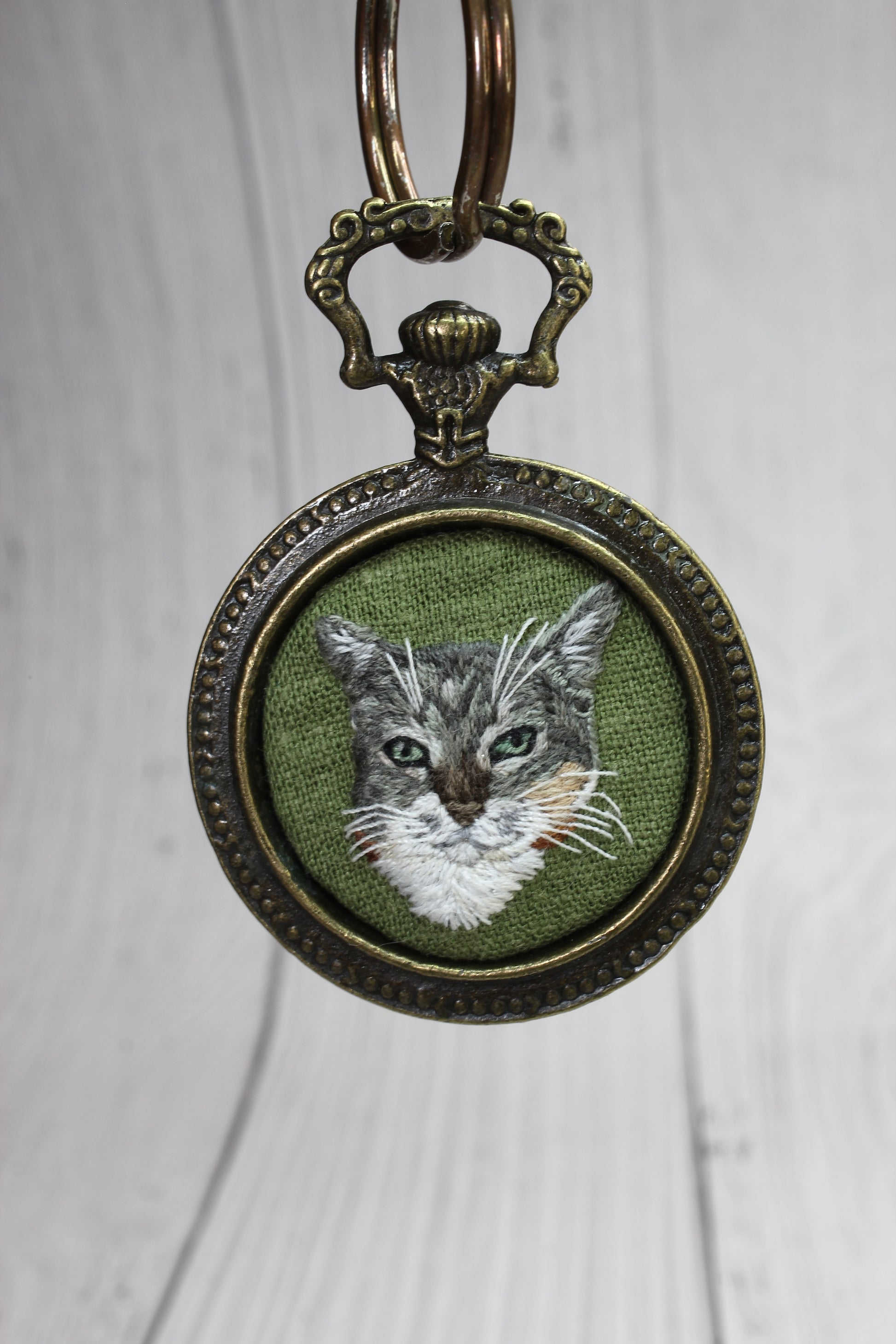Gray Tabby Cat embroidered in an olive linen fabric.