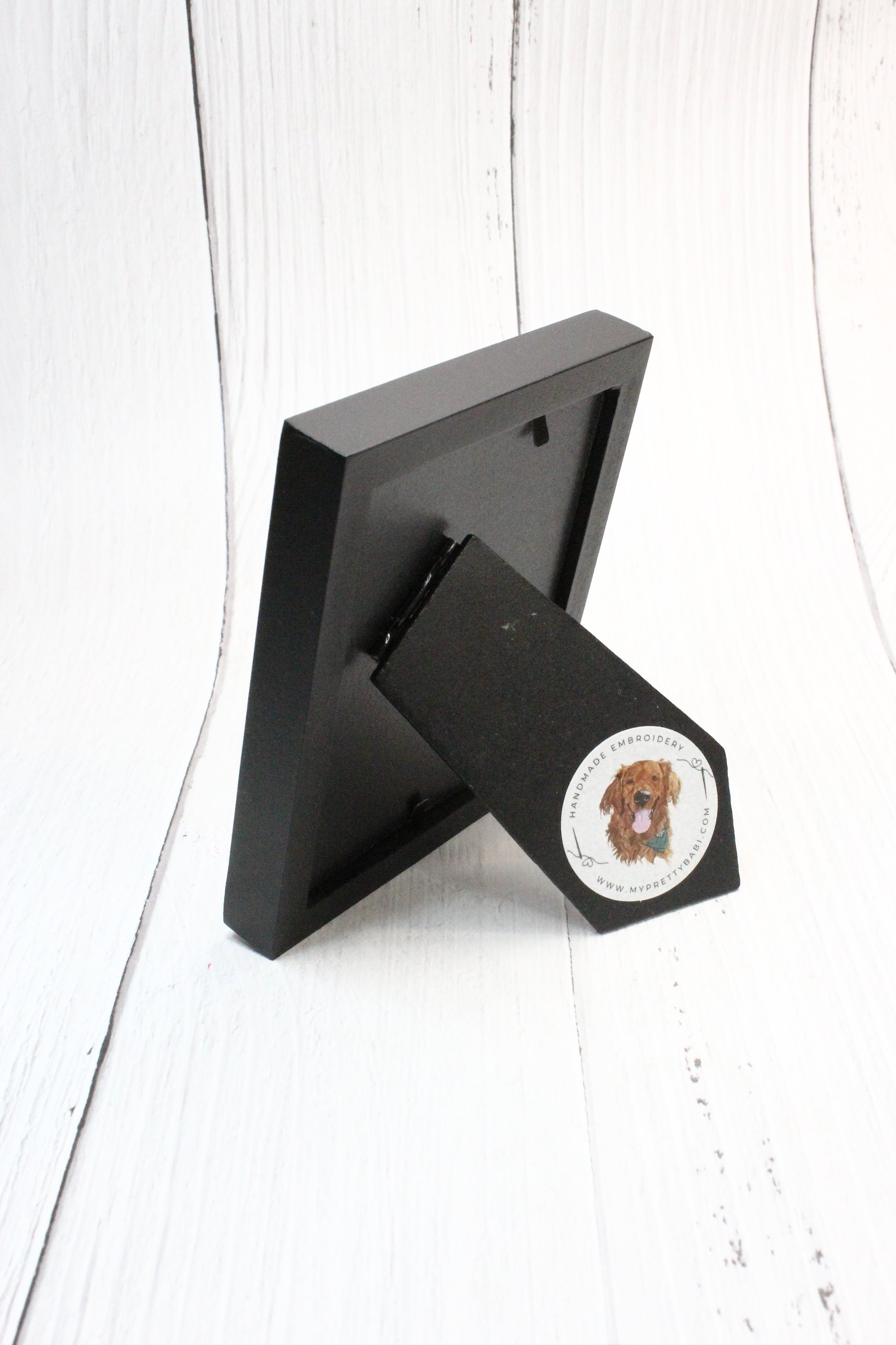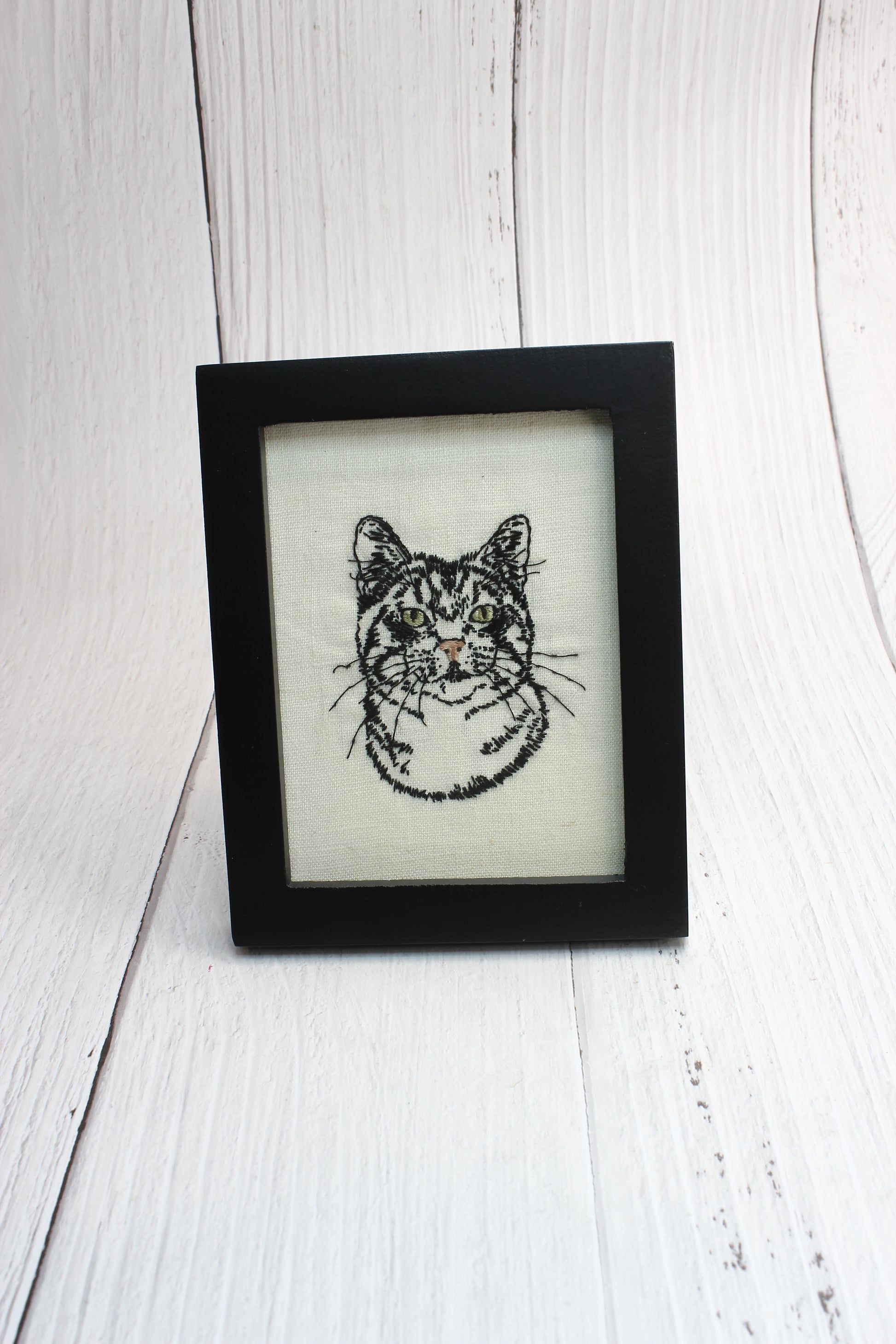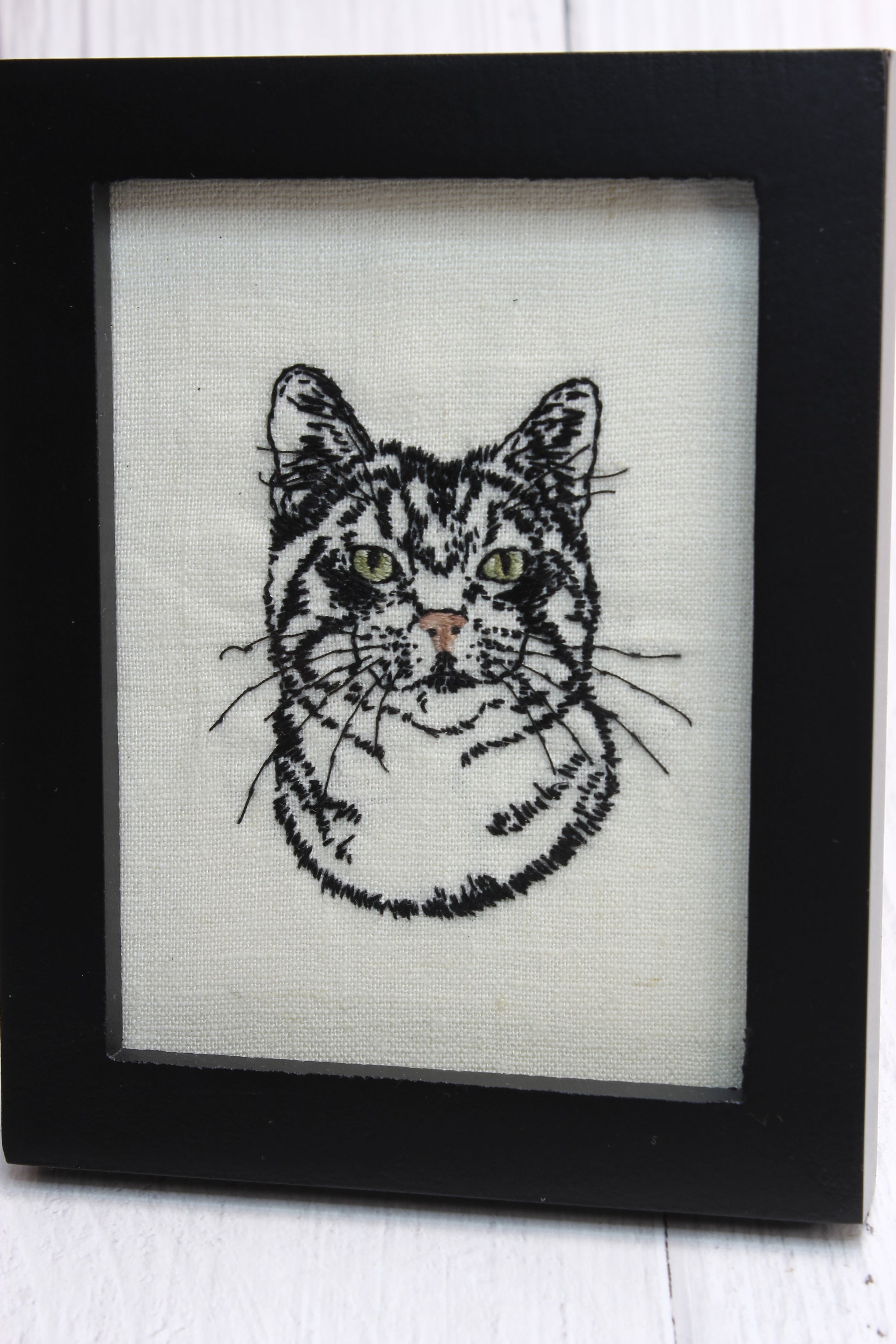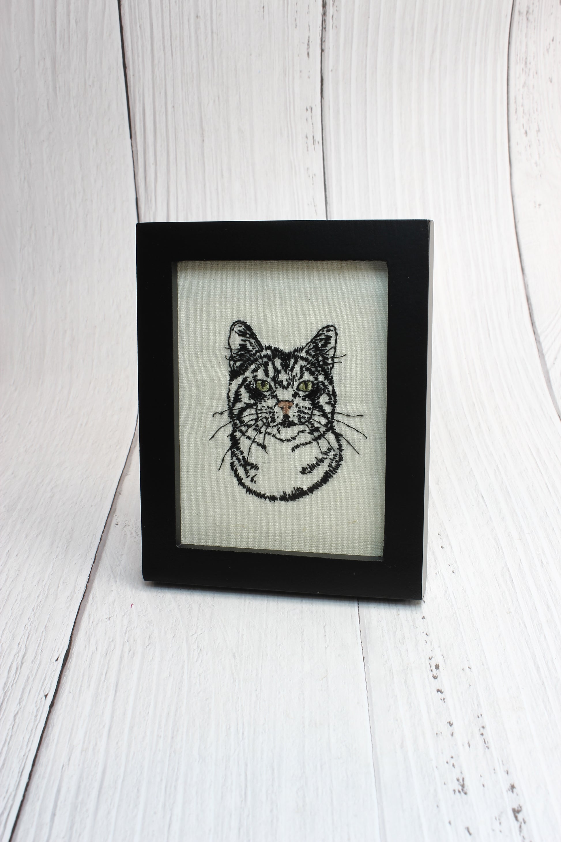 * These beautiful Tabby outlined Cat is framed on a black frame made with 100% cotton embroidery floss in a light cream Linen fabric