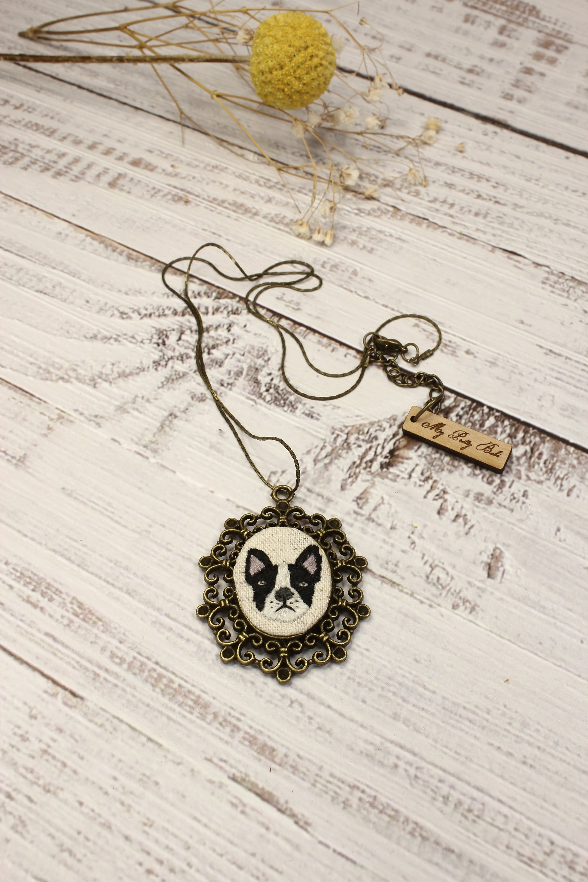 * This beautiful embroidered Filigree oval Boston Terrier necklace is made in a metal bezel with a length of 2" (5 cm) and width of 1 1/2" (3.8 cm)