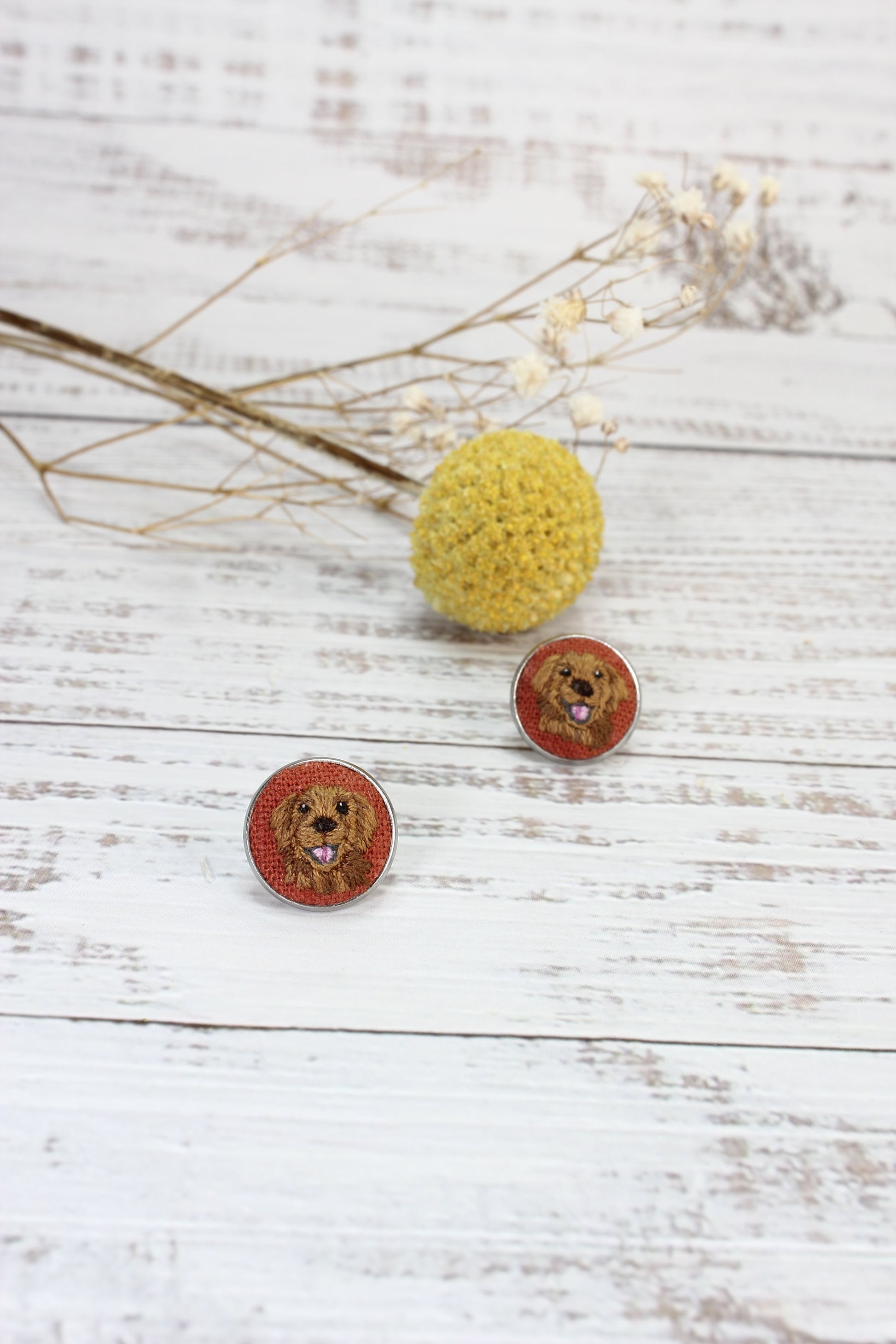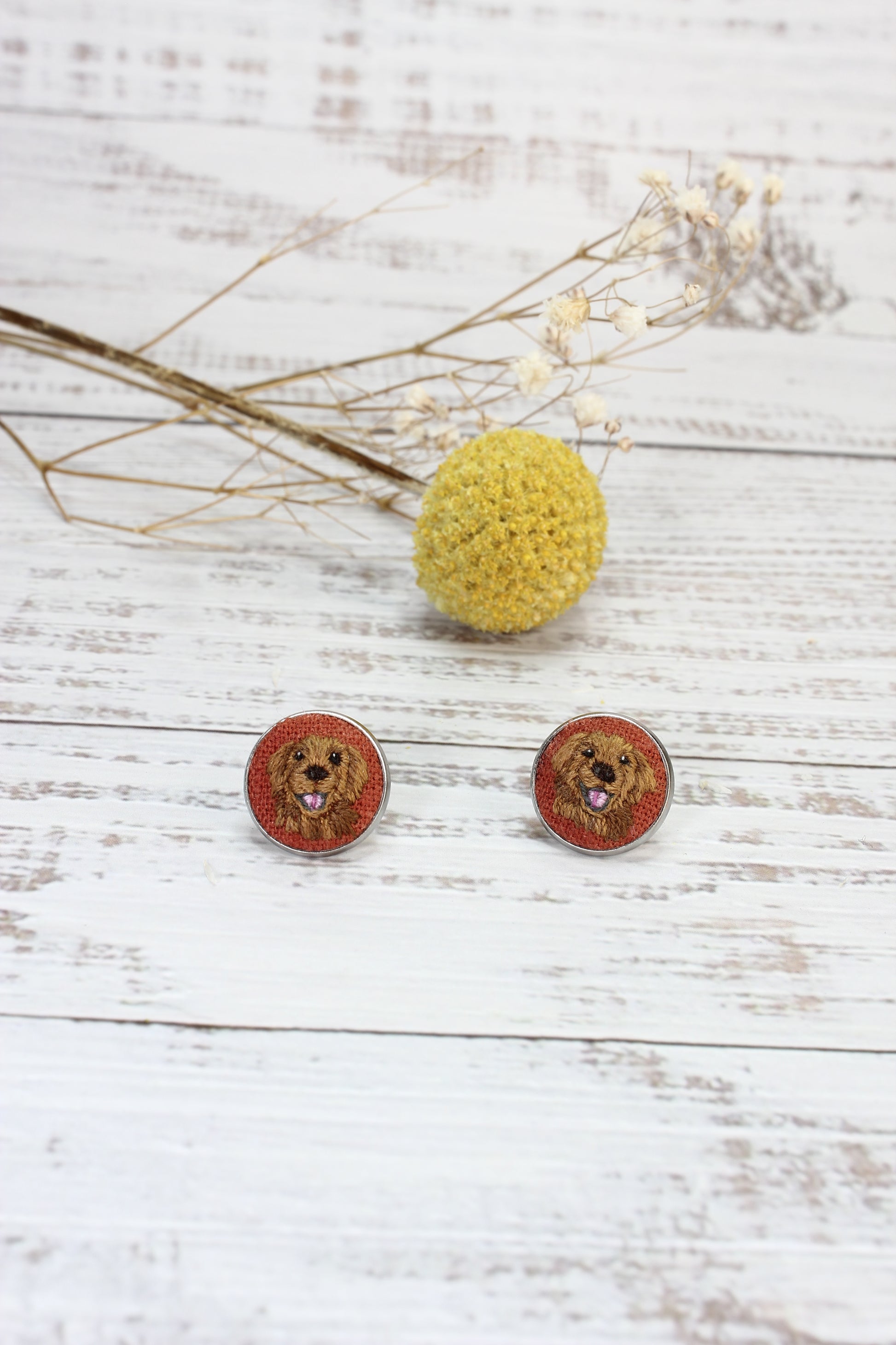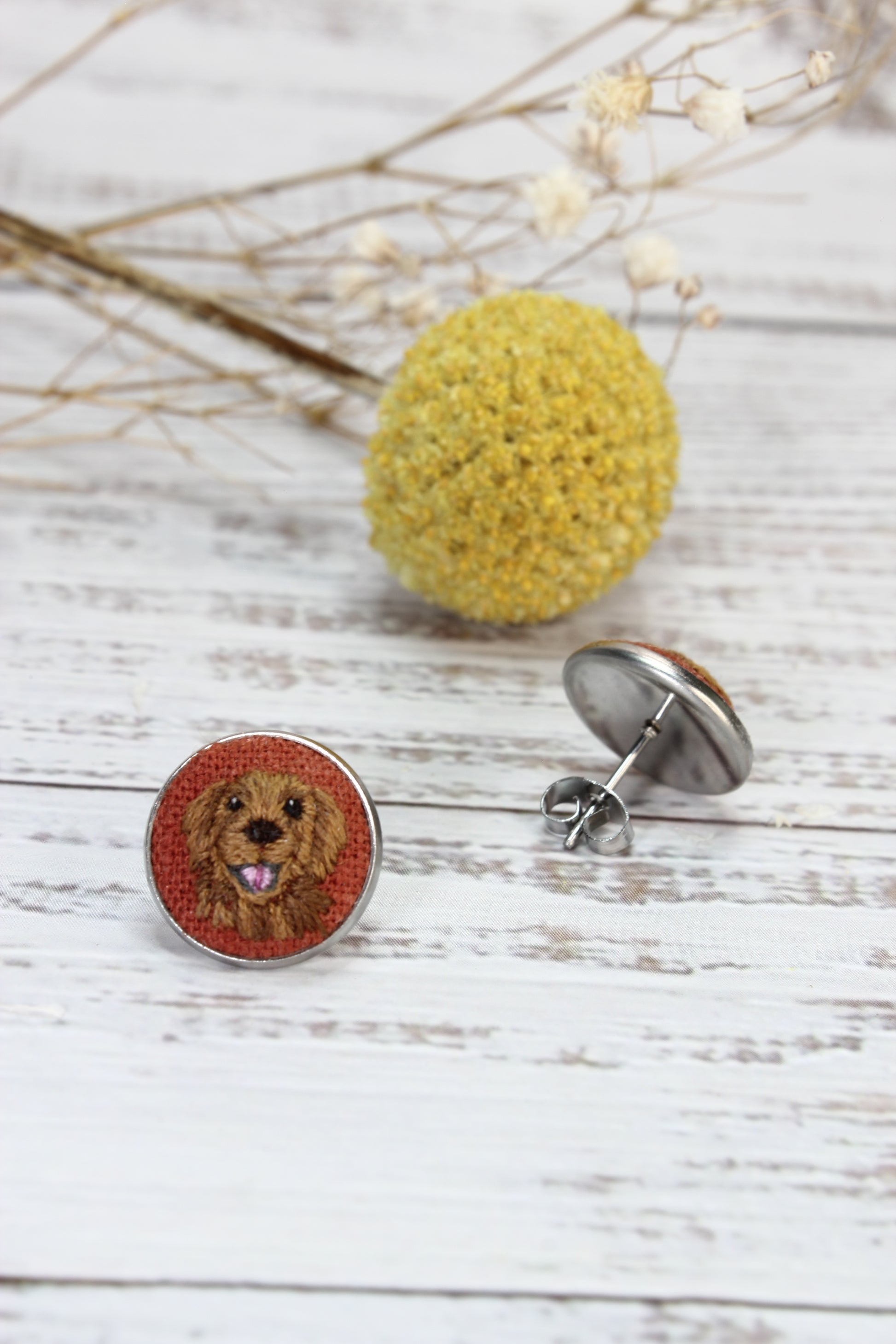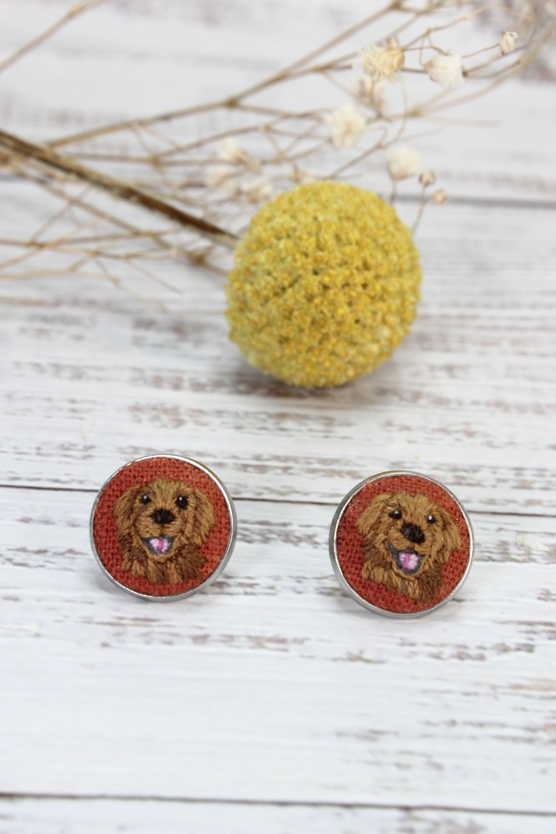 * These embroidered Golden Retriever earrings are made in a Stainless Steel Bezel