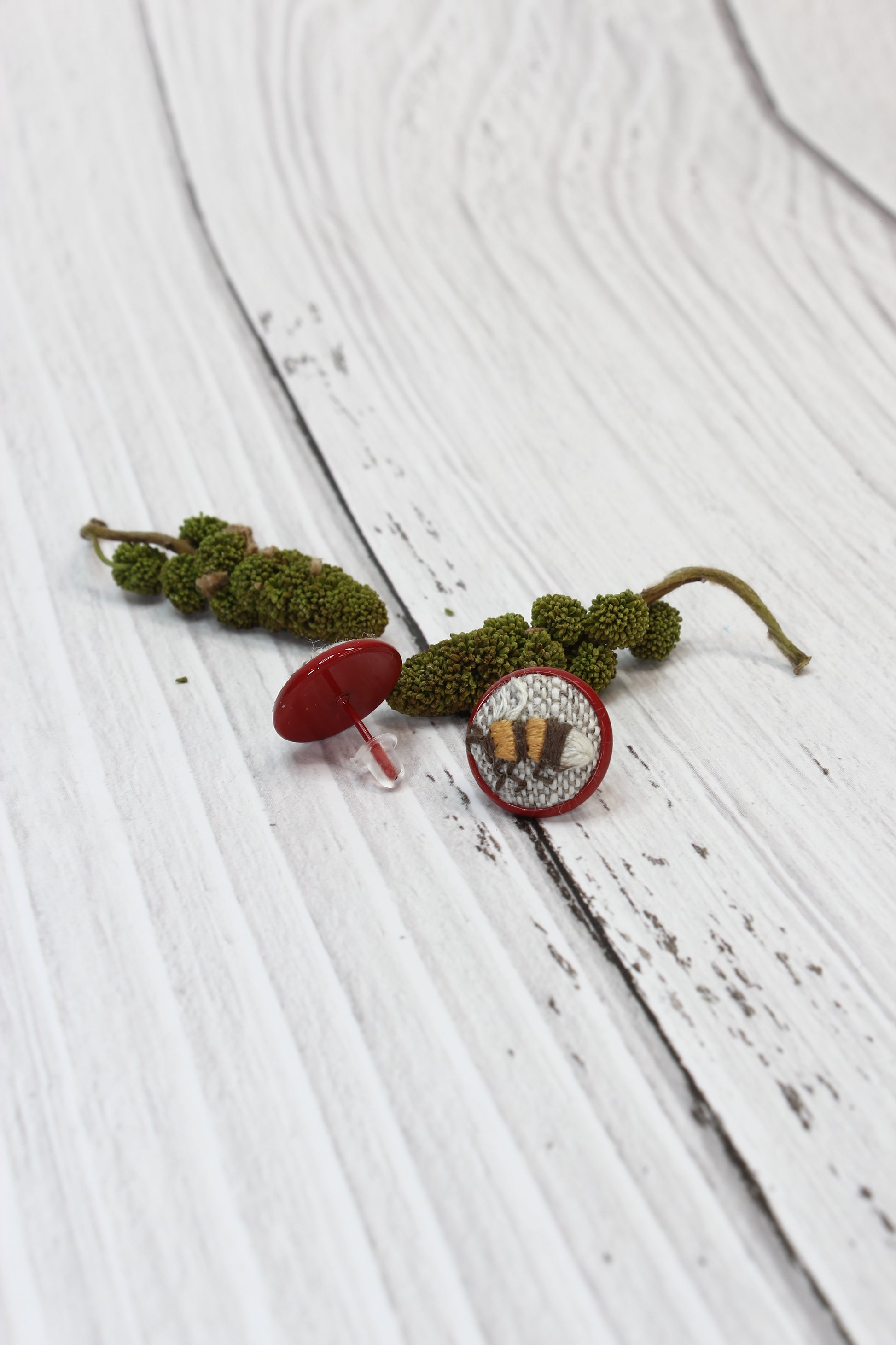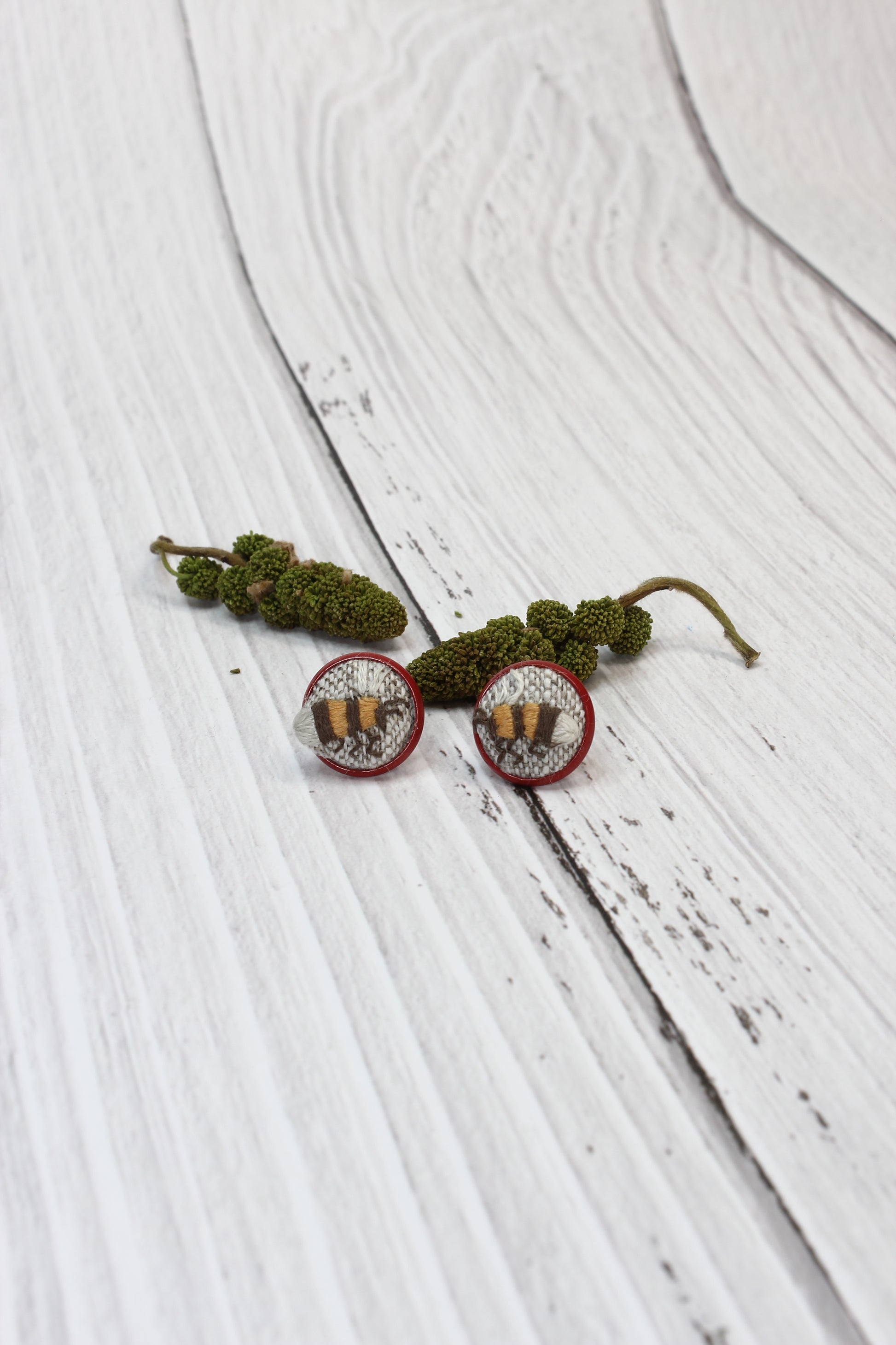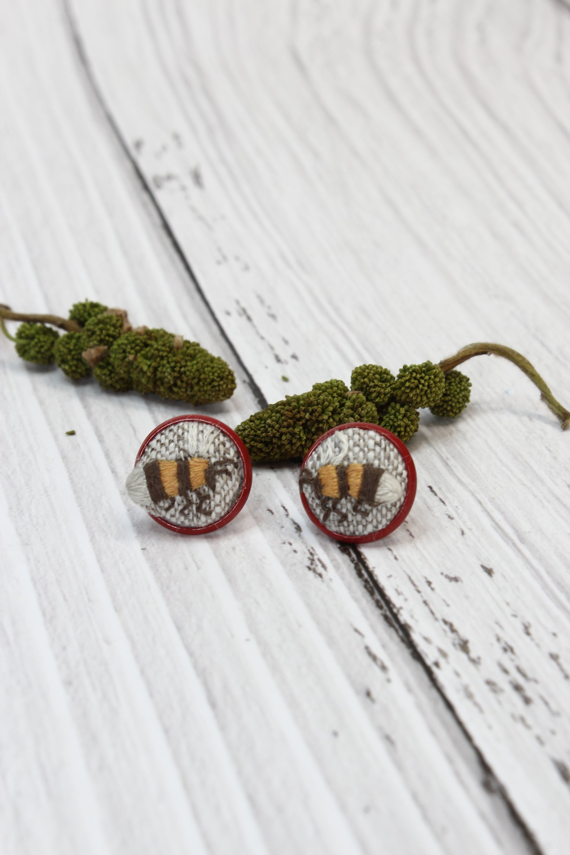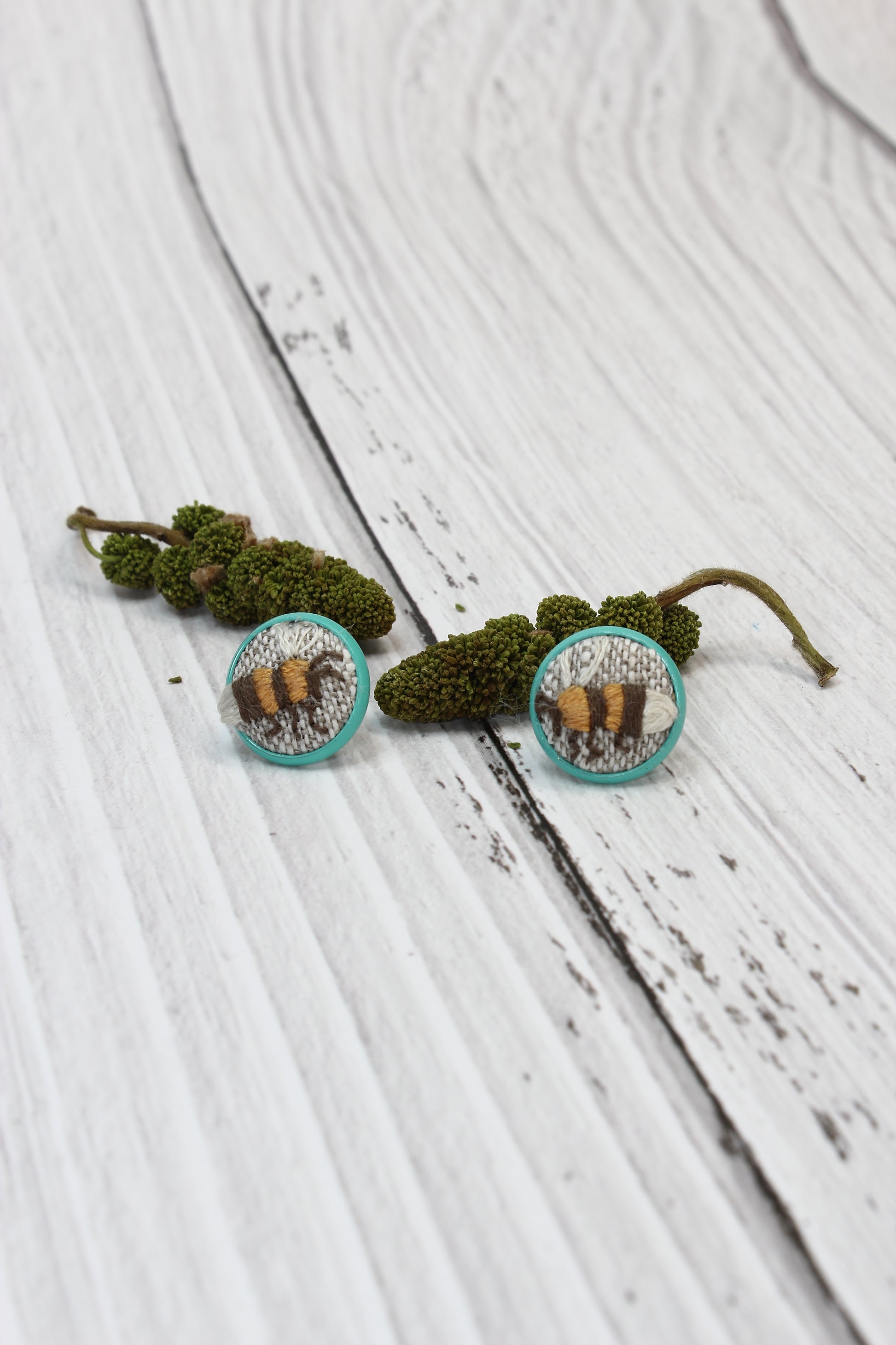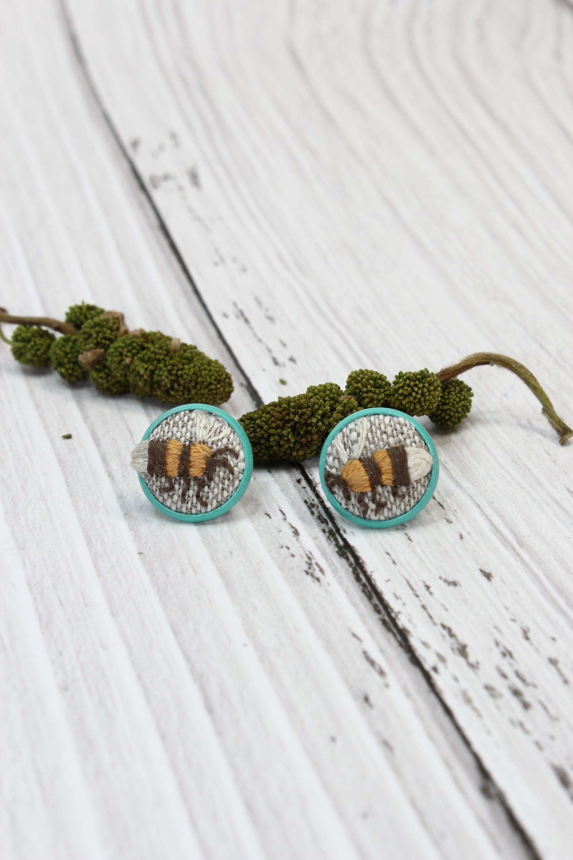 * These embroidery Bee Rose Gold Studs Earrings are made with 100% cotton embroidery floss in Light Gray Linen fabric