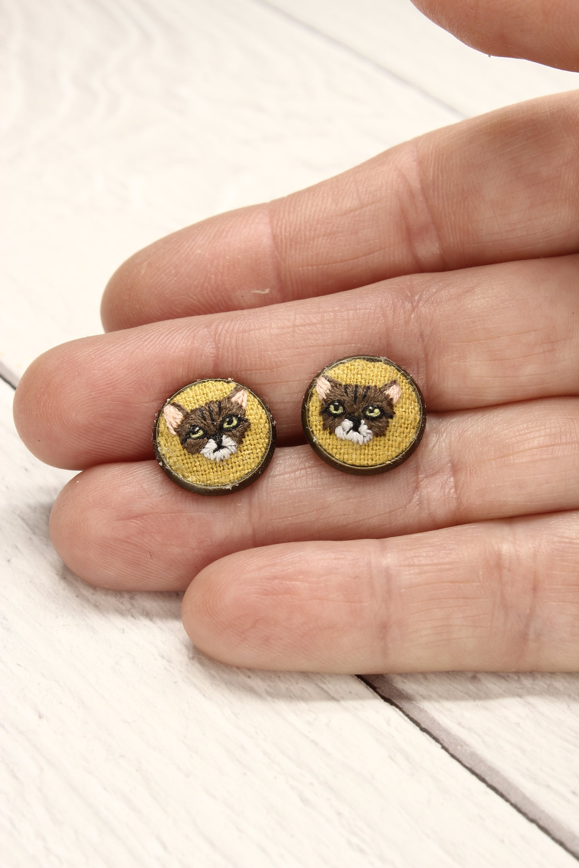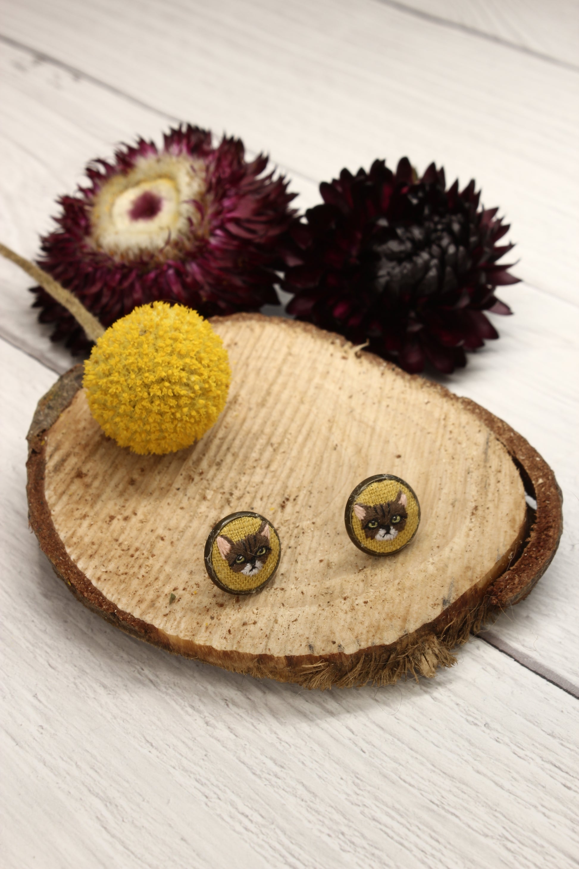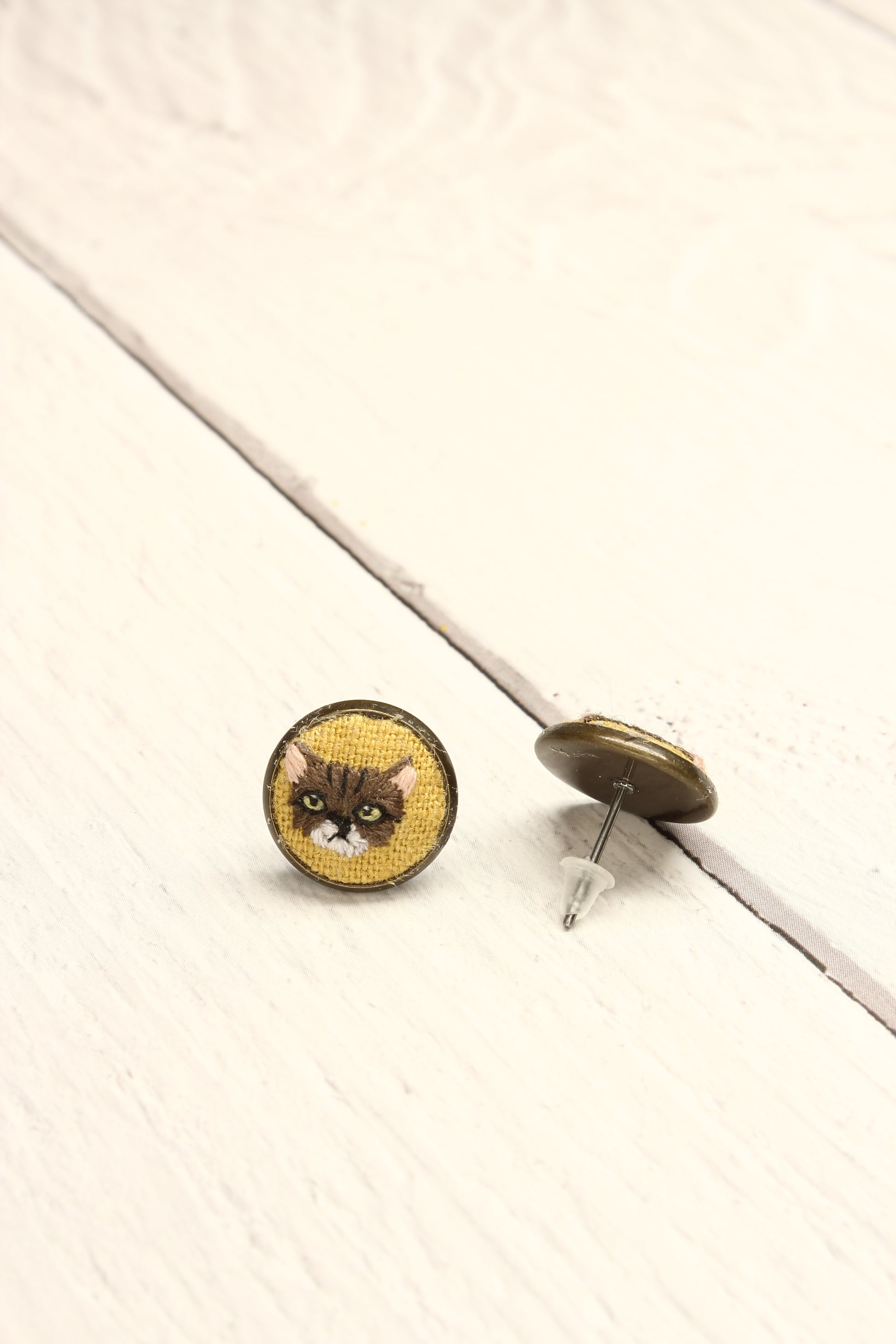 * These Embroidery Brown & White Cat Studs Earrings are made in an Antique Bronze Bezel