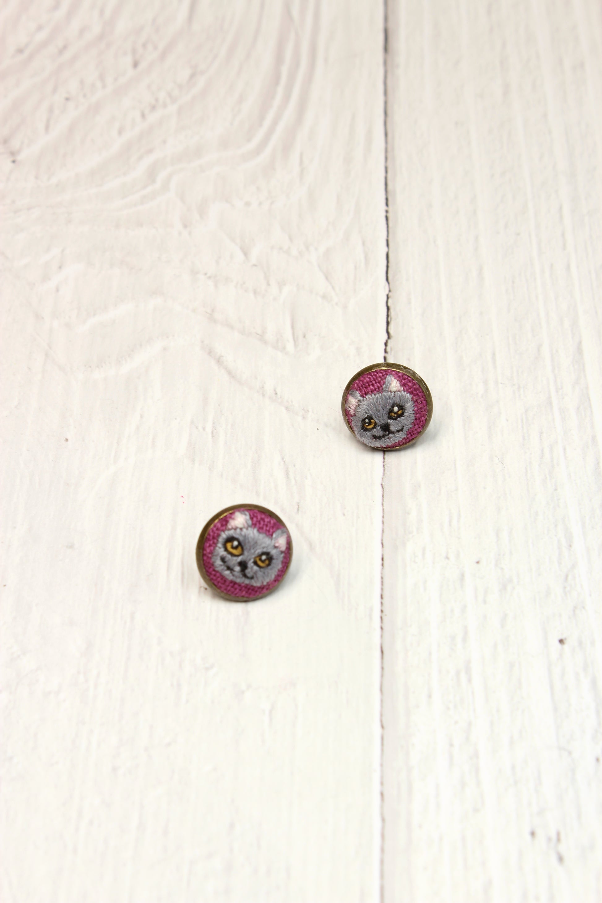 * These Gray Cat embroidered studs earrings are made in an Antique Bronze Bezel