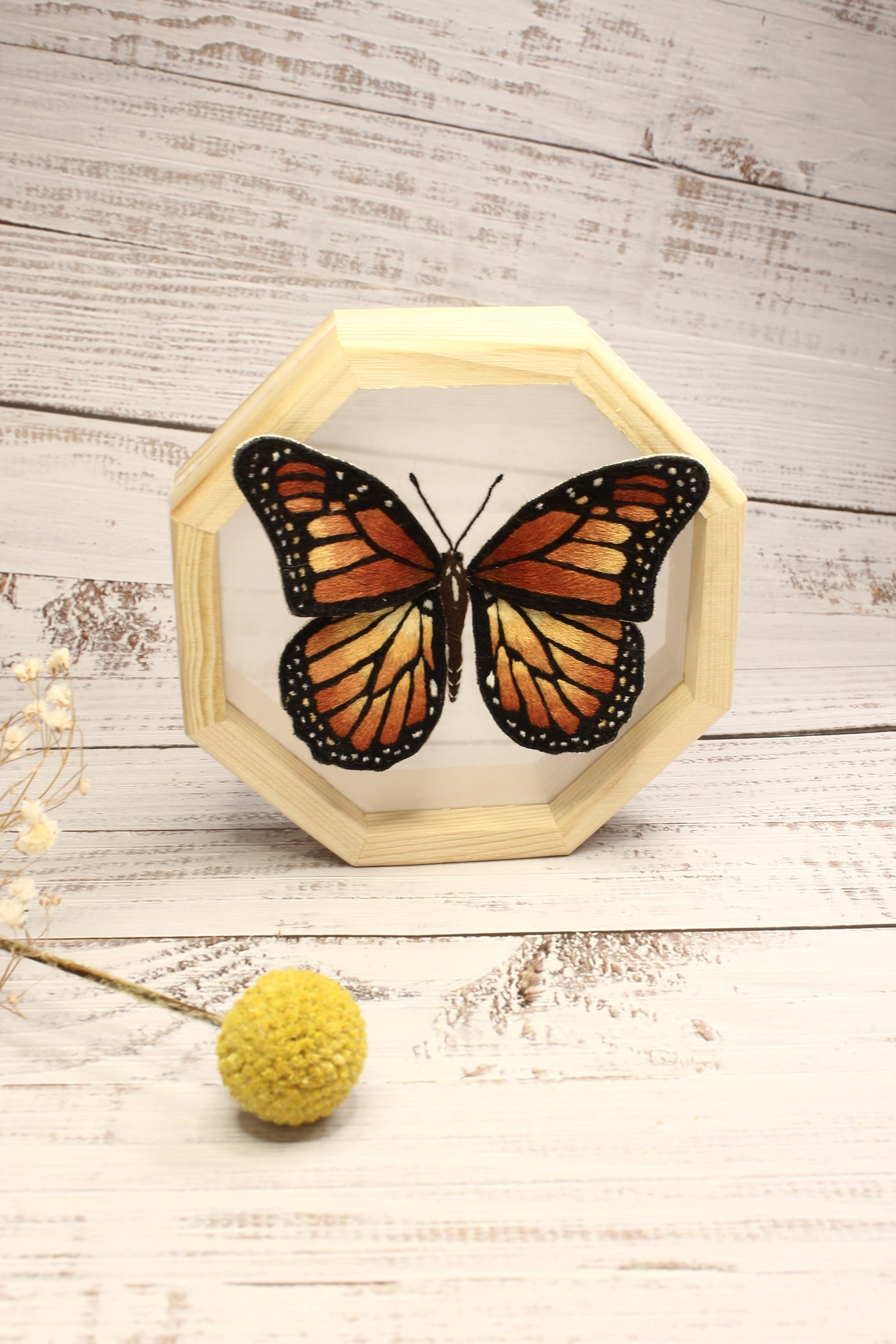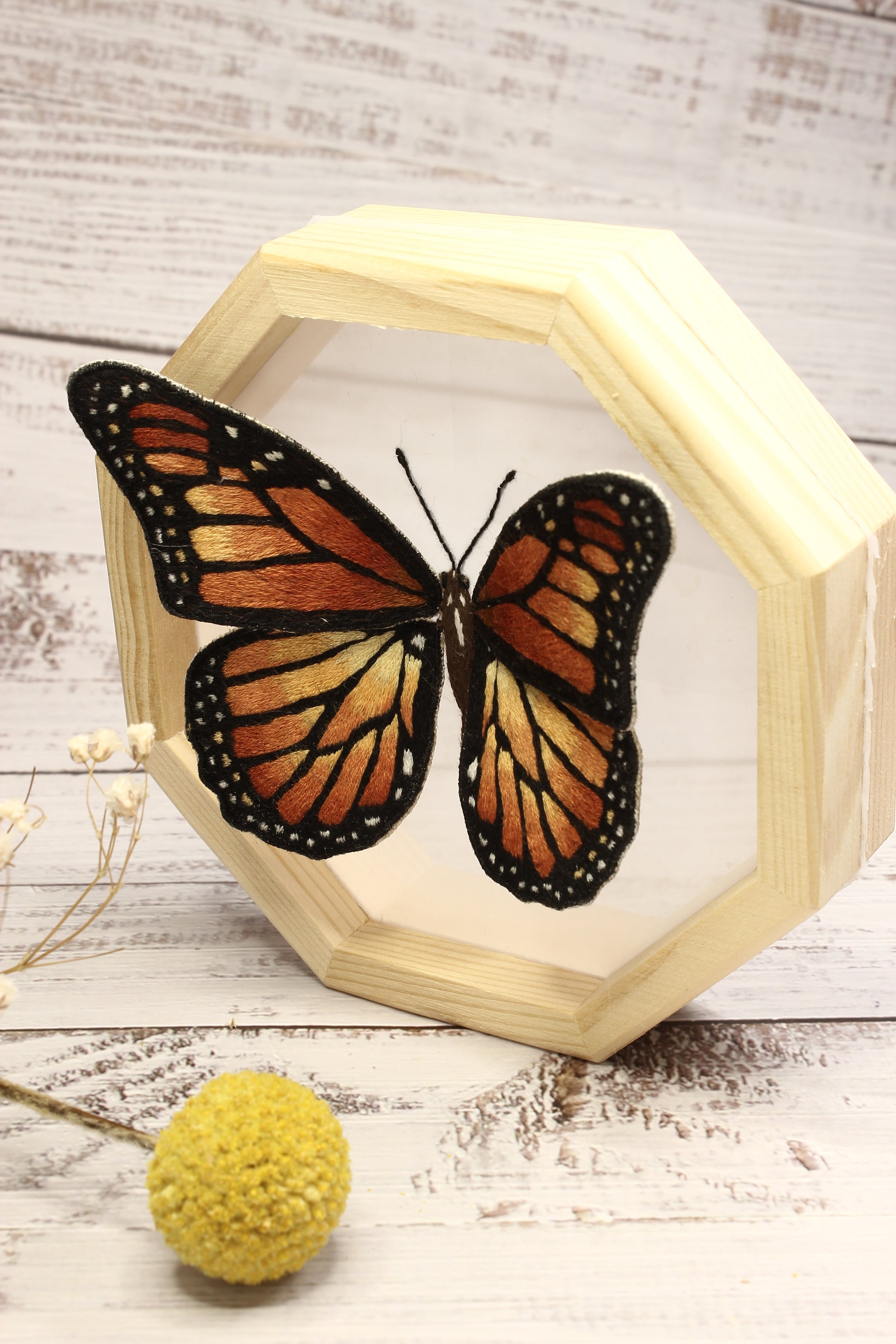 * Boasting a Octagonal wooden frame(Inner size:11x11cm/4.3in (10.2 cm by 10.2 cm), off white canvas fabric, and intricate stumpwork embroidery, this framed Monarch Butterfly is perfect for nature lovers and lovers of craftsmanship alike. Crafted with precision, this framed bee will be a treasured addition to any home and butterflies lovers.
