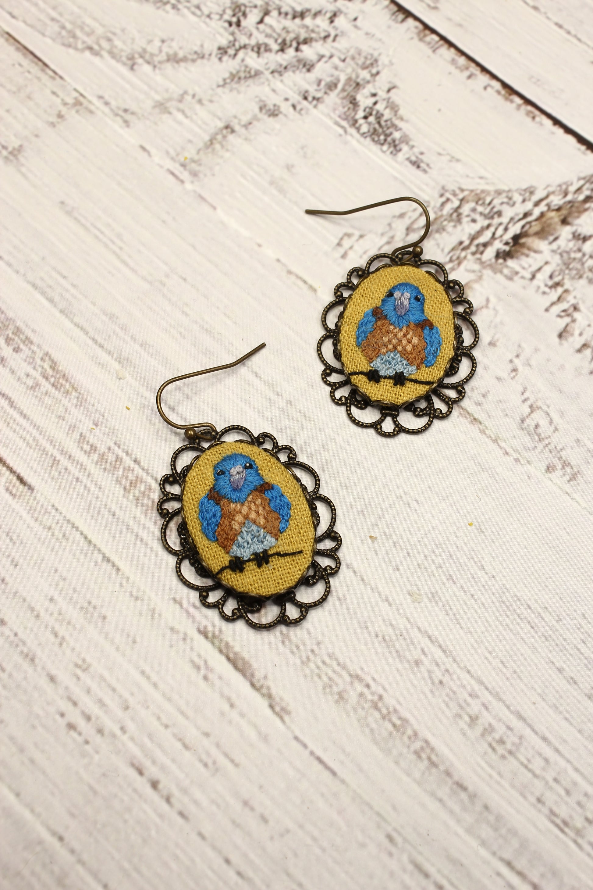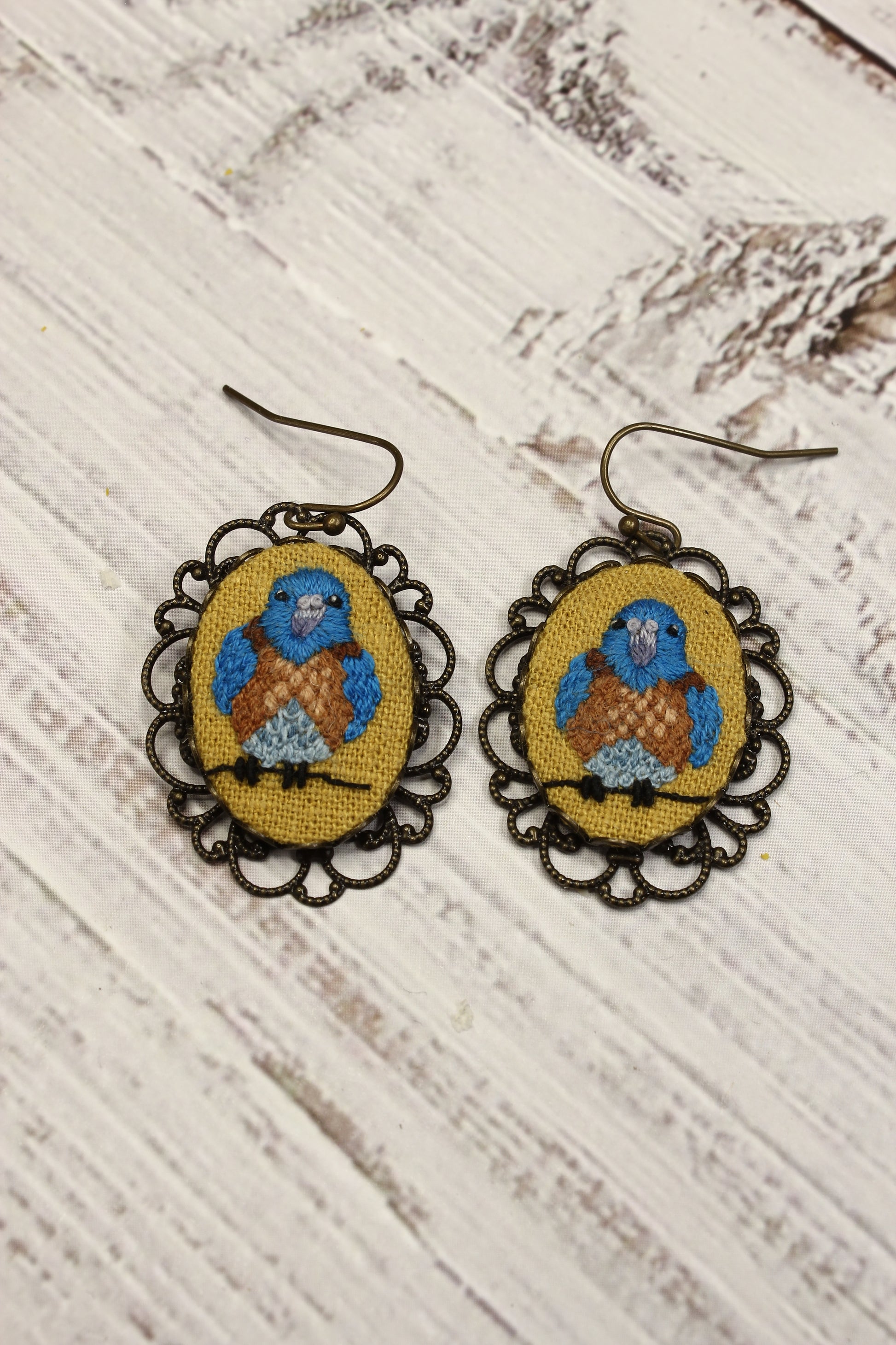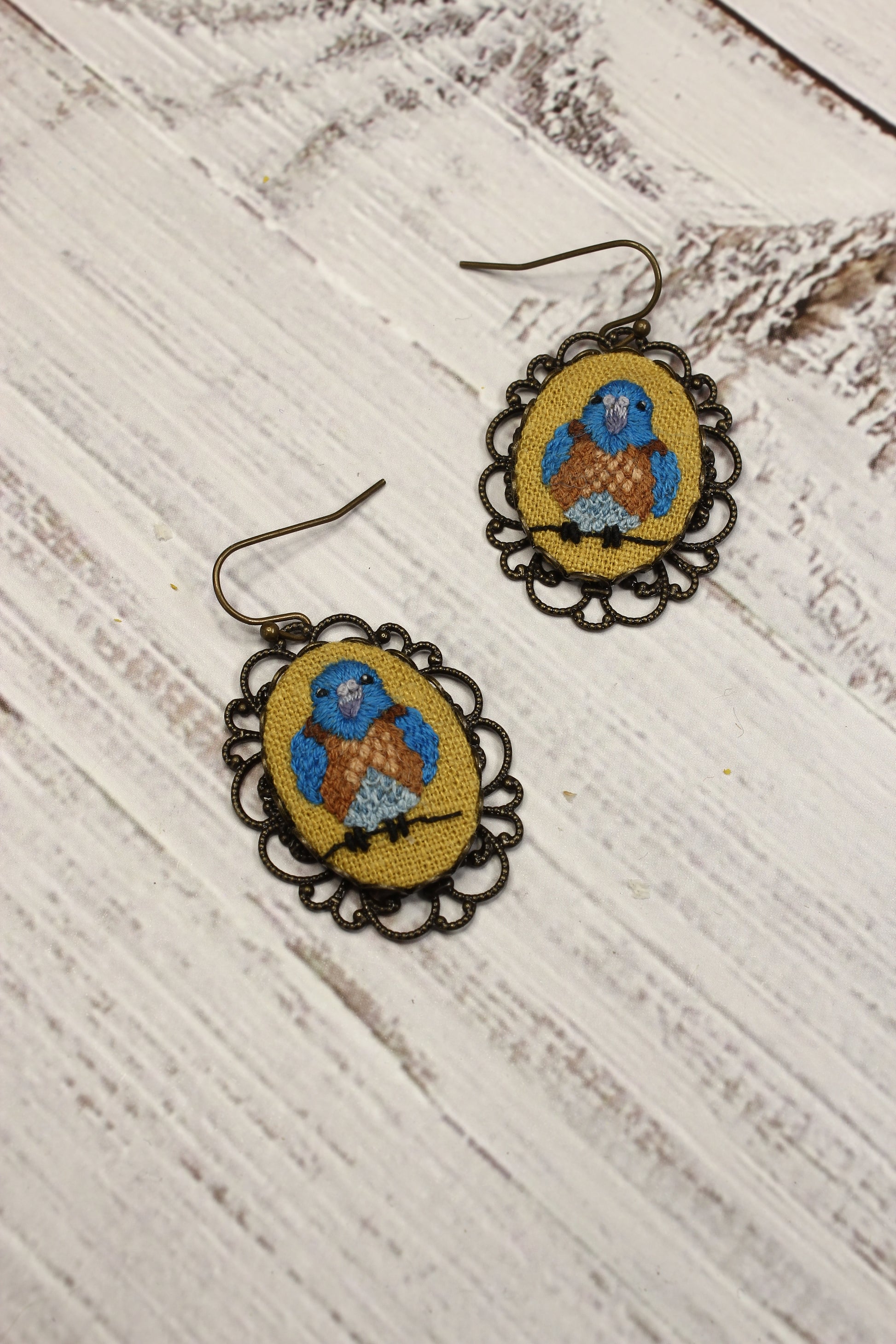 * These beautiful filigree oval embroidery earrings are made with 100% cotton embroidery floss in a Mustard Linen fabric
