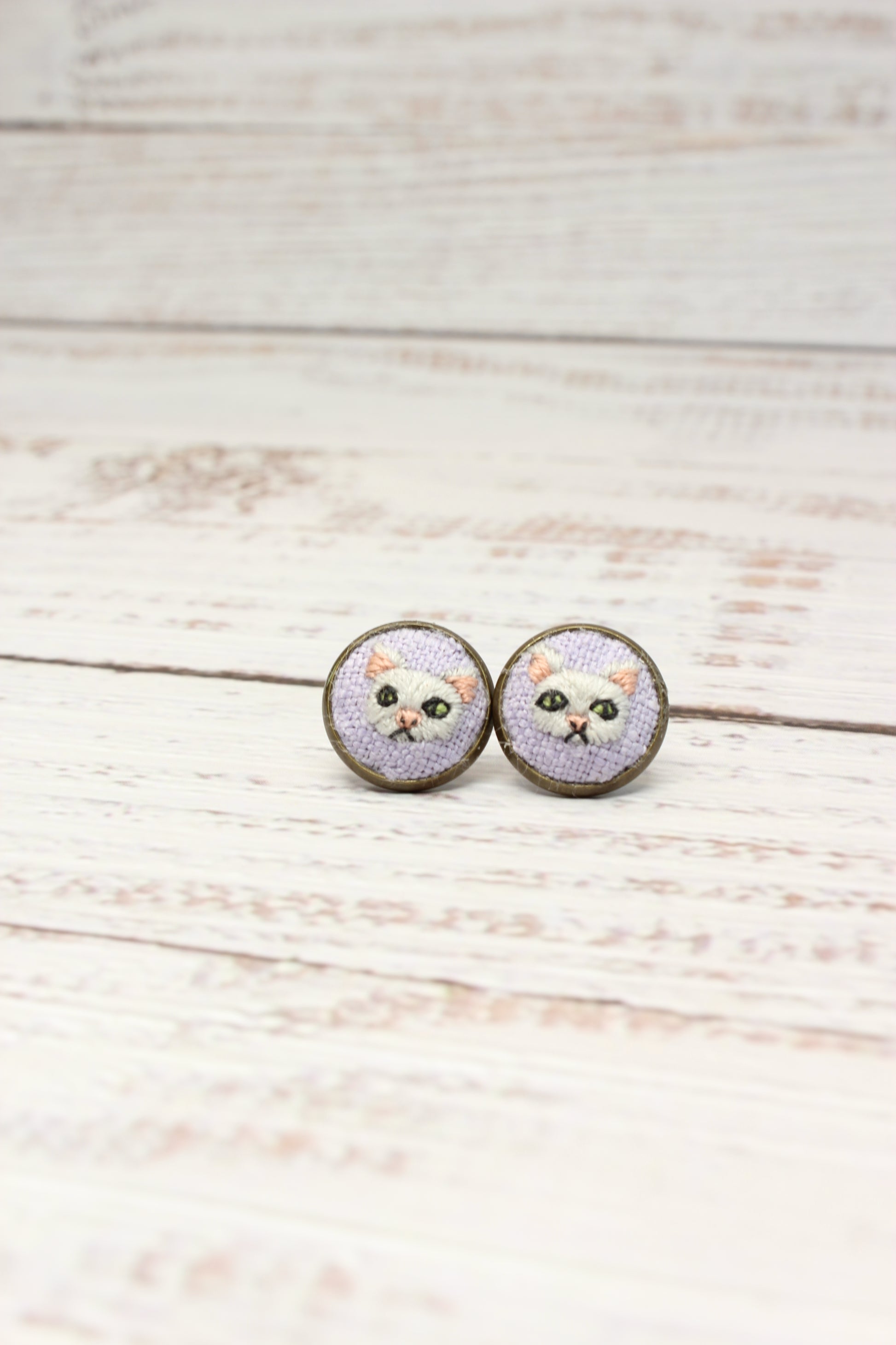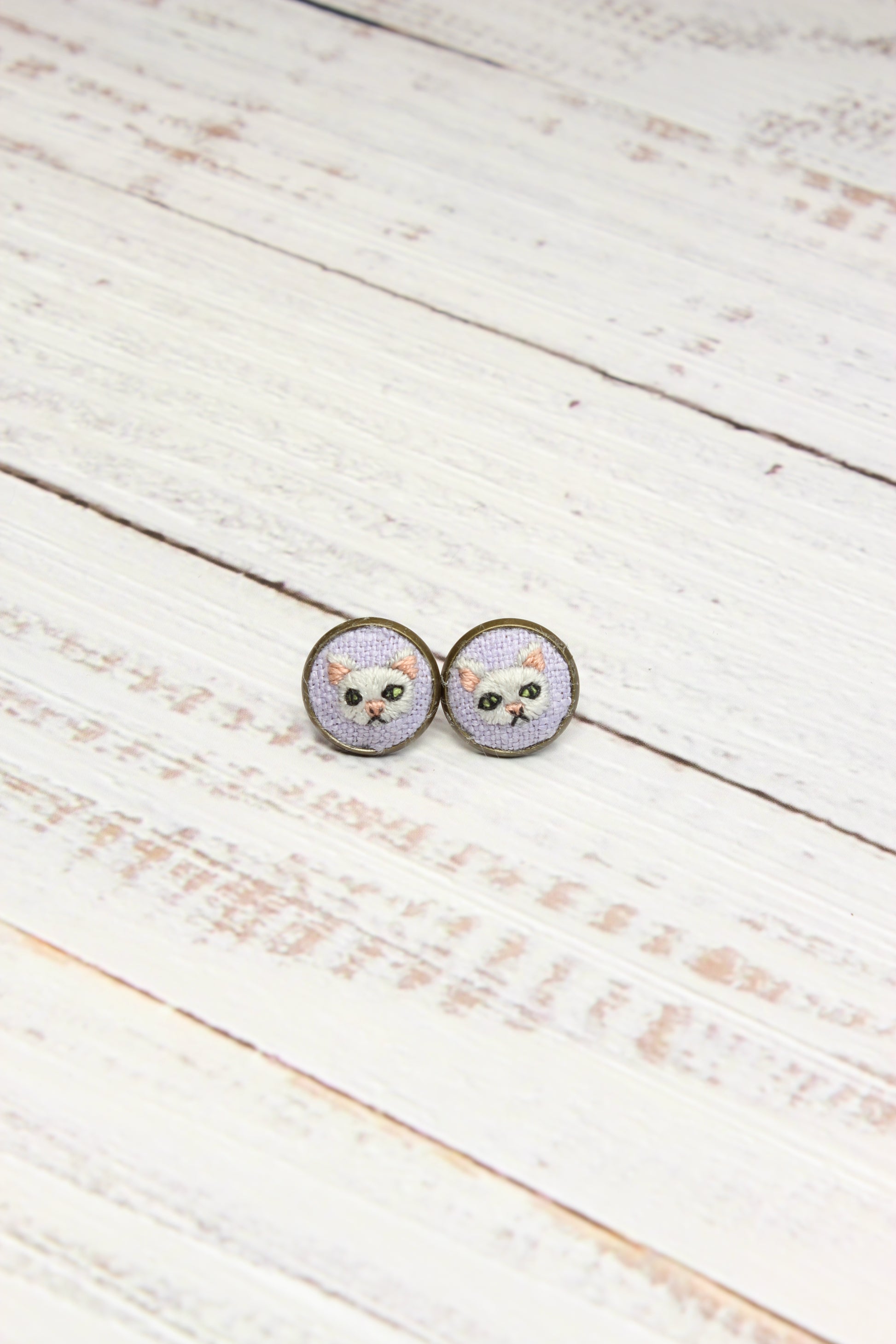 * These White Cat embroidered studs earrings are made in an Antique Bronze Bezel